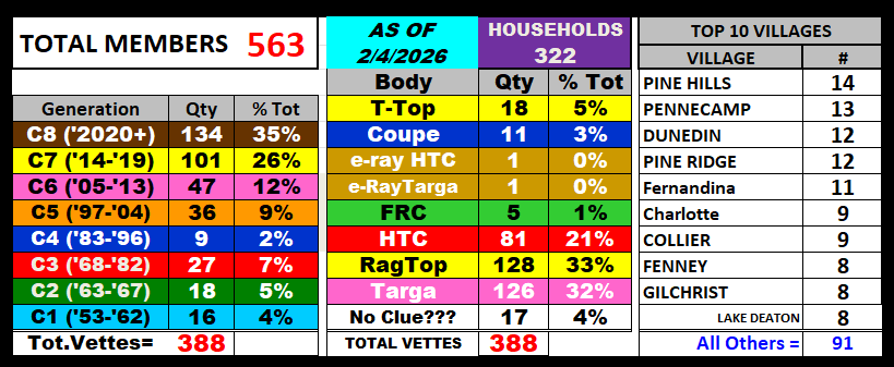 We are a "charitable based" organization of over 500 members owning nearly 400 Corvettes (plus various Classic, Foreign, & Street Rods). The club was established in 2005 and is comprised of Corvette owners who live in The Villages. The purpose of our club is to celebrate the ownership of America’s Sports Car, raise funds and supplies for local charities and enjoy the camaraderie of other Corvette enthusiasts.