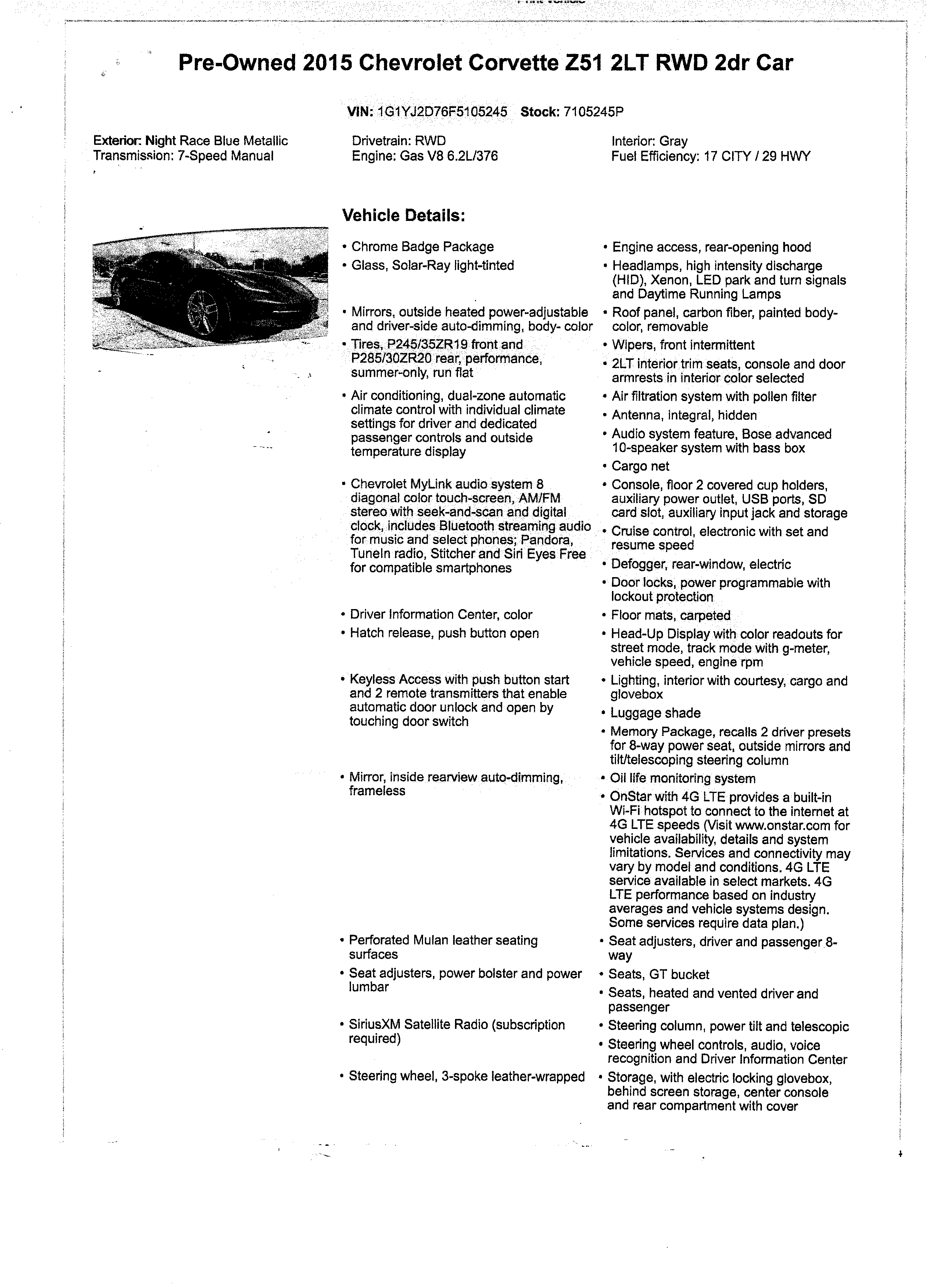 Factory Options: 3LT, Z51, Includes, 8-Way Power GT1 Seats – Mulan Leather, Keyless Access with Push-Button Start, Driver Mode Selector and Valet Mode, Dual-Zone Electronic Climate Control, Bose 10-speaker Audio System, Bluetooth Phone Connection and Phone Projection, Steering Wheel-Mounted Controls, Power Windows Express-Up/-Down, Visors with Illuminated Vanity Mirrors, Power Tilt/Telescoping Steering Wheel, Android Auto / Apple Car Play, Head-Up Display, Power Lumbar and Wing Adjustment, Wireless Phone Charging, Heated and Vented Seats, Heated Steering Wheel. Bose Performance Series 14-Speaker Audio System, Navigation with Traffic, Performance Data Recorder, Universal Home Remote Sun Visor, Power-Folding Mirrors, Rear Camera Mirror – Targa, Memory Package, Curb View Camera, Side Blind Zone Alert, Rear Cross Traffic Alert, Advanced Theft-Deterrent System, GT2 Seats with Napa Leather and Carbon-Fiber Trim, Custom Leather-Wrapped Interior, Suede-Wrapped Upper Interior Trim, Leather-Wrapped Lower Doors